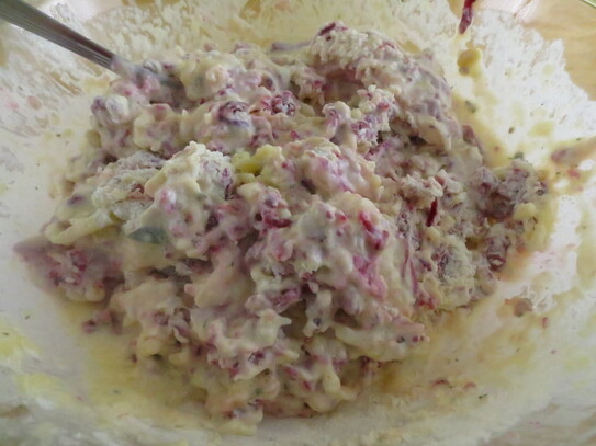 Sfecla roşie rămasă se rade pe o răzătoare cu găuri mari. Dacă sfecla a fost coaptă se pune deoparte, dacă a fost fiartă se pune 30 de minute la scurs într-o sită, pentru a elimina excesul de apă.