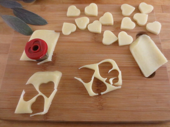 La fel se procedează cu decuparea inimioarelor din feliile de caşcaval. Odată decupate, în funcţie de imaginaţia fiecăruia se pot asorta cu inimioarele din sfeclă în diferite variante: simple sau combinate: mijlocul inimioarei se poate alege alb iar marginile roşii, şi invers.