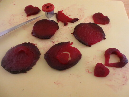 Este preferabil ca sfecla roşie să fie coaptă dinainte. Se aleg două sfecle şi se taie în felii de 2-3 cm grosime. Din ele se decupează inimioare folosind forme de biscuiţi. Resturile de sfeclă ce cad de la decupat se pot mărunţi şi adăuga la sfecla rasă.