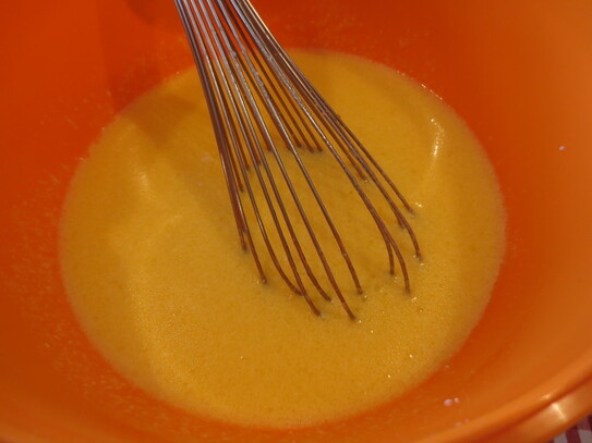 2. Apoi, într-un alt vas se bat uşor ouăle, până când albuşurile şi gălbenuşurile se mixează, după care se adaugă treptat laptele bătut, uleiul, coaja rasă şi sucul de lămâie. Se amestecă toate aceste ingredientele până când sunt bine încorporate.