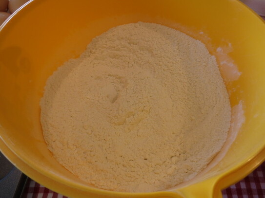 3. Se combină amestecul lichid cu cel uscat amestecând uşor prin mişcări circulare de sus în jos atât cât să se încorporeze ingredientele. Dacă se amestecă prea mult, aluatul nu va mai creşte.