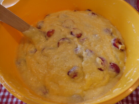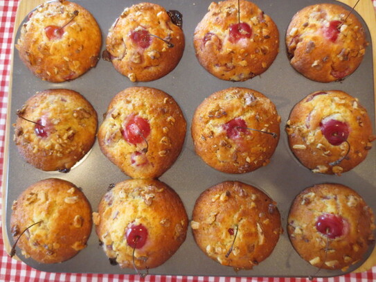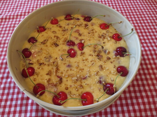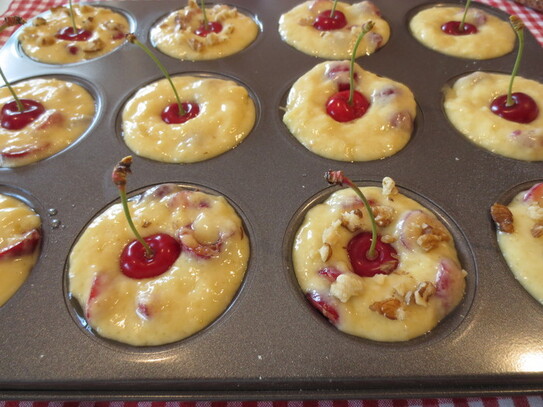 Aluatul se toarnă în formele de brioşe. În mijlocul fiecărei forme se pune o cireaşă întreagă cu tot cu sâmbure şi codiţă. Pe deasupra se presară miez de nucă zdrobită.