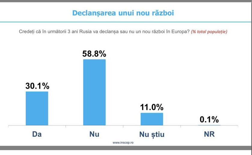 30.1% dintre respondenţi cred că în următorii 3 ani Rusia va declanşa un nou război în Europa, în timp ce 58.8% sunt de părerea contrarie. 11% nu ştiu iar 0.1% nu răspund.