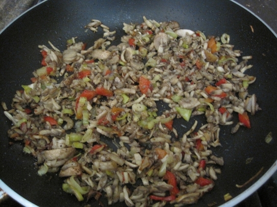 Se face foarte simplu. Într-o tigaie încinsă, se răstoarnă bucăţele de carne marinate , inclusiv sucul folosit la marinat, se presară puţin oregano şi se lasă să fiarbă până când scade tot lichidul din tigaie. După ce se răcesc, cubuleţele de carne se folosesc la umplerea celorlalte două bucăţi de vinete rămase, precum şi a tuburilor obţinute din praz.