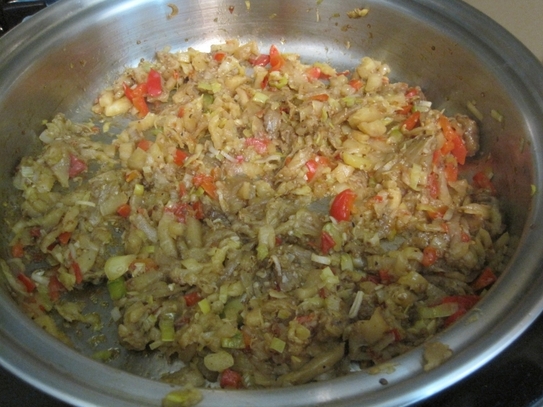 La fel ca şi pentru umplutura de ciuperci, mai întâi se pune într-o tigaie, o lingură de ulei la încălzit. Se adaugă prazul tăiat în rondele şi restul de ardei/gogoşar mărunţit, după care se adaugă miezul de vinete, dovlecel şi câteva bucăţele de roşii. Se fierbe în continuare la foc mic, până când legumele se înmoaie, apoi se adaugă sare, piper şi nucşoara. Se lasă deoparte să se răcească, după care se sparge un ou şi se amestecă bine. Cu pasta obţinută se umple celălalt dovlecel şi ardei precum şi gogoşarul.