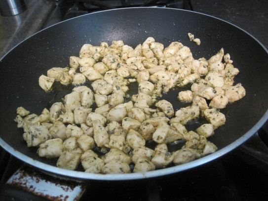 Înainte de-a începe cu pregătirea legumelor, este recomandat să puneţi pieptul de pui la marinat. Carnea se spală în apă rece, se şterge cu un prosop de hârtie, apoi se taie în cubuleţe. Se pune într-un castron, se adaugă sare, piper, oregano, o lingură de ulei de măsline, suc de la o jumătate de lămâie, sau 1-2 linguri de oţet de mere. Se lasă să stea la frigider cel puţin câteva ore.