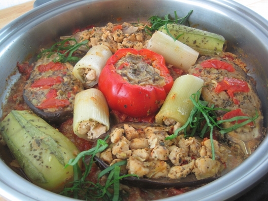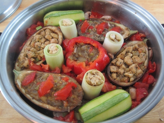 Nu mai rămâne decât aranjarea legumelor într-o caserolă. Se aşterne mai întâi un strat format din cubuleţele de roşii, amestecate cu câteva bucăţi de ciuperci tăiate, sare şi piper. Se aranjează apoi legumele umplute, se adaugă 1-2 căni de apă, după care se presară cu oregano. Legumele umplute se pot fierbe pe plită sau se pot da la cuptor, dacă materialul din care e făcută caserola permite.