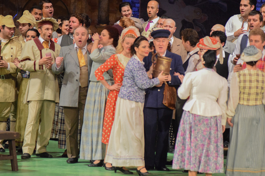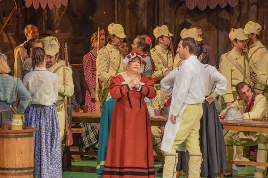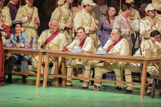 În scena a II-a, întâlnim o adunarea poporană, a unui grup de soldaţi, aflaţi în mijlocul familiilor lor, serbându-şi plecarea pe câmpul de luptă. Este o scenă unde cântecul dublează buna-dispoziţie bahică. Corul cântă cu însufleţire, în principal, două teme: vinul (plăcerea) şi războiul (curajul şi moartea). Aici ni se înfăţişează soldatul Valentin – interpretat de baritonul Iordache Basalic – , care îi încredinţează prietenului său Siébel, băieţandru jucat de mezzo-soprana Sidonia Nica, straja virginităţii surorii sale. În tălmăcirea rugăciunii soldatului pentru viitorul Margueritei, pentru familie şi patrie, Basalic îşi dozează foarte bine suflul şi întreţine secvenţe lungi, dar expresive, în legato, iar crescendo-ul final, moderat, păstrează dulceaţa tonului.