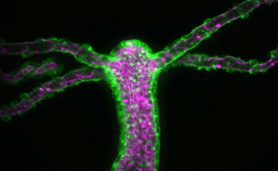 Pentru a efectua cercetarea a fost folosită specia Hydra vulgaris. În imaginea de mai sus se pot vedea straturi de ţesut extern şi intern (respectiv verde şi magenta), la o scară de 200 de microni.