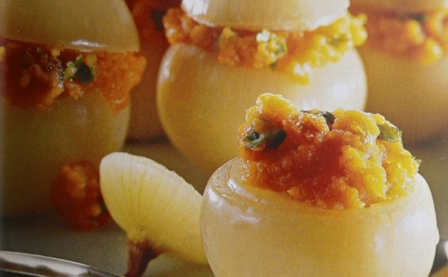 Curăţaţi ceapa şi ţineţi-o la abur timp de 15-20 de minute, până când se înmoaie; tăiaţi căpăcelele superioare şi eliminaţi straturile interioare ale fiecărei cepe pentru a obţine un fel de boluri.