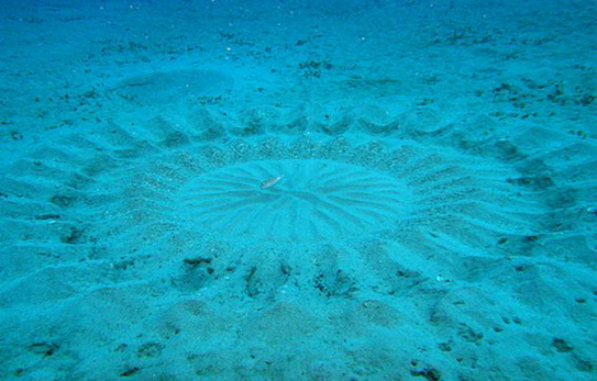 Această dantelă delicată de nisip ar fi opera unui mic peşte glob (numit şi peşte minge sau peştele Tetraodontidae*) de doar câţiva centimetri de lungime, care înoată neobosit zi şi noapte pentru a crea minunate sculpturi prin simpla fluturare a aripioarei.