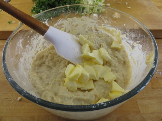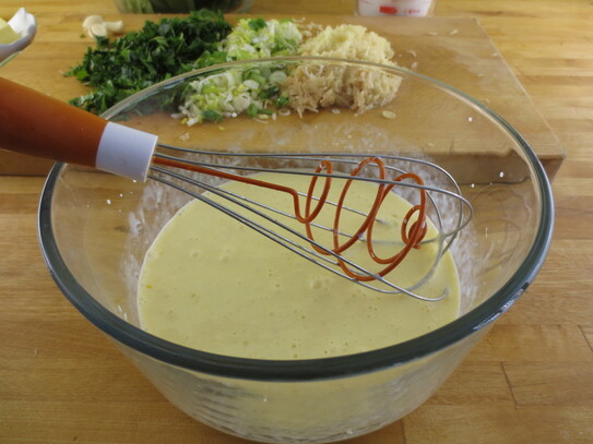 Într-un castron de mărime potrivită, se bat ouăle cu ajutorul unui tel în formă de pară sau o furculiţă, până când albuşurile şi gălbenuşurile se amestecă bine. În timp ce continuaţi să amestecaţi, se toarnă smântâna în fir subţire, continuând apoi cu ulei/ untul. Se adaugă apoi făina, sarea şi piperul. Se amestecă totul bine până când se obţine o pastă destul de consistentă.