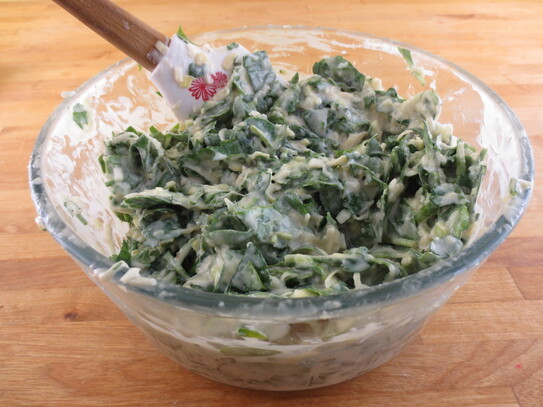Peste aluatul din castron se adaugă apoi cartoful ras, rondele de ceapă şi usturoi, pătrunjelul verde mărunţit şi leurda/spanacul tăiat. Se amestecă totul până ce se omogenizează, apoi se lasă deoparte 10 -15 minute.