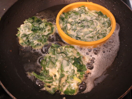 Într-o tigaie se pune ulei la încălzit, când acesta este înfierbântat, se pune câte o lingură cu vârf din amestecul preparat, având grijă că grosimea chiftelei să fie uniformă şi forma cât de cât rotundă. Pentru o formă perfect rotundă, puteţi folosi o formă de silicon specială, care se pune în tavă şi se umple uniform cu pasta de verdeaţă.