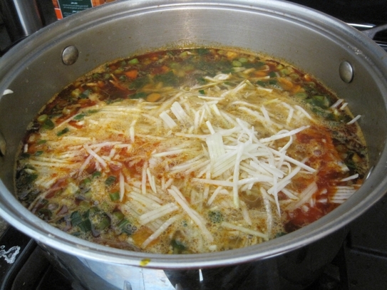 Când zarzavatul este pe jumătate fiert se adaugă guliile curăţate şi tăiate în formă de bastonaşe. Se mai adaugă sare şi piper dacă e necesar, apoi se lasă să fiarbă în continuare până când guliile sunt fierte.