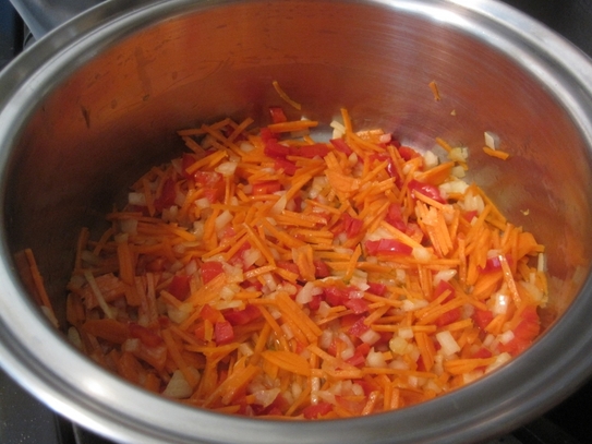 Ceapa, morcovul şi ardeiul se curăţă şi se mărunţesc.
