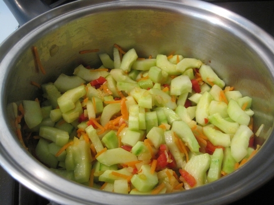 Se pun 2 linguri de ulei în oala în care se face supa, apoi se adaugă ceapa şi ardeiul tocat. Se amestecă de câteva ori, apoi se pune morcovul ras sau tăiat în rondele subţiri. După ce morcovul îşi schimbă uşor culoarea, se adaugă bucăţile de castravete. Se amestecă bine, apoi se adaugă 1.5 litri de apă şi sare. Se fierbe în continuare la foc mic până când bucăţile de castravete devin transparente şi se pătrund uşor când sunt testate cu o furculiţă.