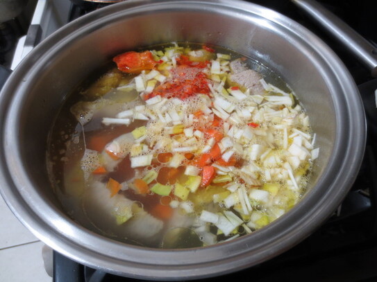Între timp se curăţă zarzavaturile: ceapa, morcovii, pătrunjelul şi ţelina se spală, se curăţă, apoi se taie mărunt. Ardeiul se taie în cubuleţe mici, după care zarzavaturile se adaugă în oală.
