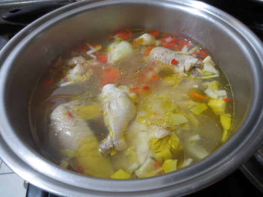 Carnea de găină se curăţă şi se spală în apă rece, apoi se pune la fiert într-o oală cu 3-4 l de apă fierbinte în care s-au adăugat o lingură de sare. După ce începe să fiarbă, se reduce focul la mic şi se lasă să fiarbă cam o jumătate de oră. Cu o spatulă fină se îndepărtează spuma care se formează.