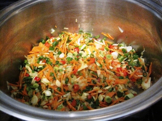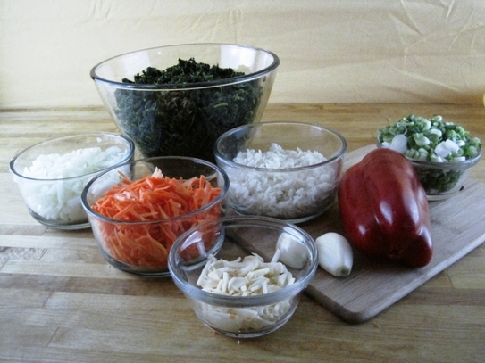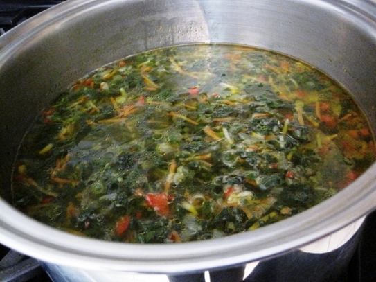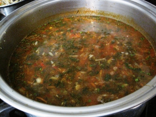 Ceapa se toacă mărunt şi se căleşte în ulei. Se adaugă zarzavatul de supă, dat în prealabil printr-o răzătoare fină. Se călesc împreună, după care se pun în vasul cu urzici. Se adaugă şi orezul.