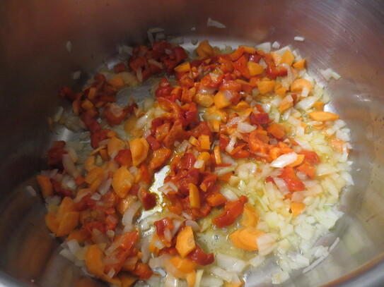 Morcovii se taie în rondele subţiri, iar ceapa curăţată şi ardeii se toacă mărunt. Roşiile se curăţă de pieliţă, apoi se taie în cubuleţe.