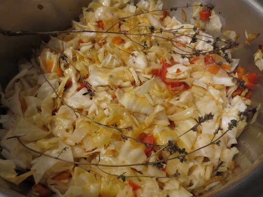 Între timp, varza se taie în bucăţele, se freacă cu sare şi se lasă deoparte să se înmoaie.
