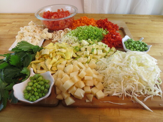 Între timp se curăţă zarzavatul. Ceapa sau prazul, morcovii, pătrunjelul, roşiile, ardeiul, cartoful şi dovlecelul se taie cubuleţe. Varza se taie fideluţă, fasolea se curăţă de aţe şi se rupe în bucăţele, iar boabele de mazăre se scot din teci. Conopida se curăţă şi se taie în florete mici.