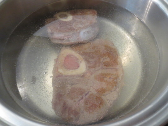 Carnea de vită se pune la fiert într-o oală cu 5 l apă fierbinte în care s-a adăugat o linguriţă rasă de sare. Opţional, dacă doriţi să aveţi o supă clară şi mai puţină spumă de îndepărtat, înainte de-a pune carnea în oală, o puteţi prăji uşor pe o plită încinsă sau grătar, lăsând-o nu mai mult de un minut pe fiecare parte.