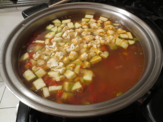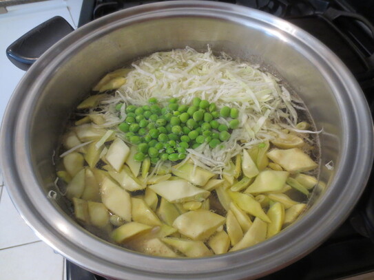 După ce carnea a fiert aproape o oră, se adaugă pe rând legumele. Fasolea, mazărea şi varza necesită un timp mai lung de fierbere, aşa că se adaugă la început. După ce se lasă să fiarbă vreo 15 minute, se adaugă morcovii, pătrunjelul, ardeiul, roşiile şi prazul/ceapa.