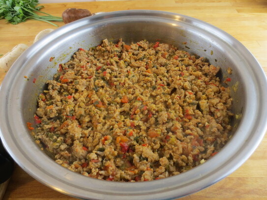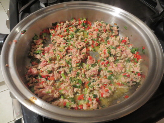 Într-o tigaie largă se pun 2 linguri de ulei de măsline, apoi se adaugă ceapa, usturoiul şi ardeiul. După 2-3 minute, când ceapa devine sticloasă, se adaugă picioruşele de ciuperci şi carnea de pui tocată. Se amestecă bine şi se lasă în continuare pe foc până când carnea îşi schimbă culoarea.