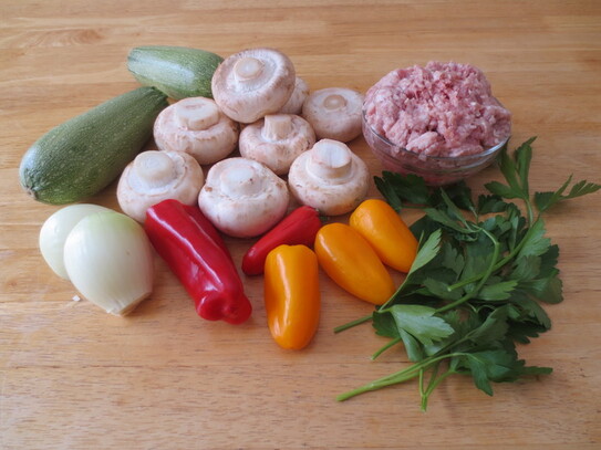 Se încălzesc 2 linguri de ulei de măsline într-o tigaie mare la foc mediu-mare. Se adaugă ceapa tocată, împreună cu ardeii mărunţiti şi ciupercile şi se fierbe aproximativ 3 - 4 minute, amestecând din când în când cu o lingură de lemn.