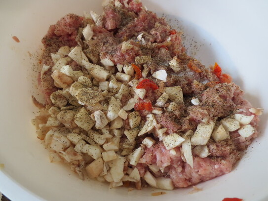 Se reduce temperatura la mediu şi se adaugă carnea tocată. Se lasă pe foc până când aceasta începe să îşi schimbe culoarea. Se dă deoparte şi se adaugă pesmetul, apoi se asezonează cu sare şi piper după gust. Dacă doriţi puteţi adăuga în compoziţie şi câteva linguriţe de pătrunjel verde tocat.