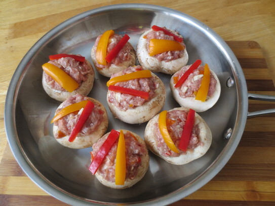 Pălăriuţele ciupercilor se umplu generos cu amestecul de carne. Opţional, ciupercile se pot orna pe deasupra cu două feliuţe de ardei. Ciupercile se pun într-o tavă şi se dau la cuptor, pe grătarul din mijloc.