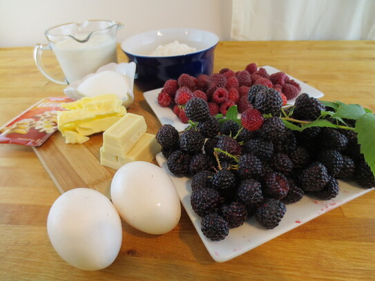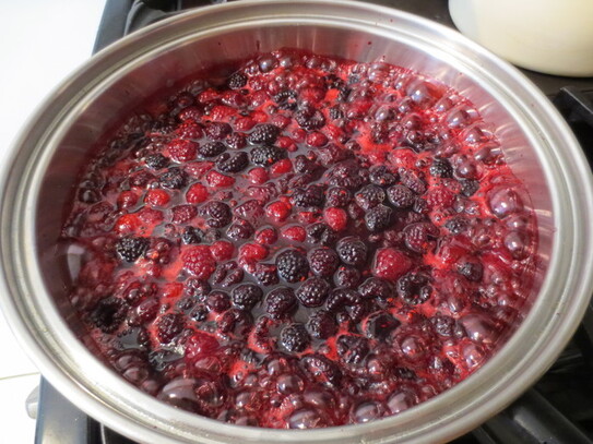 Între timp se prepară umplutura din fructe de pădure. Murele şi zmeura se pun la foc într-o tigaie sau cratiţă. Se presară peste ele cele 8 linguri de zahăr şi se adaugă 4 linguri de apă. Se fierb la foc mic/mediu până când se topeşte zahărul. Fructele se stropesc cu zeama de lămâie, se mai lasă 1-2 minute apoi se iau de pe foc. Pentru a da mai multă consistenţă sucului lăsat de fructe, jumătate din fructe se pot zdrobi cu o furculiţă.
