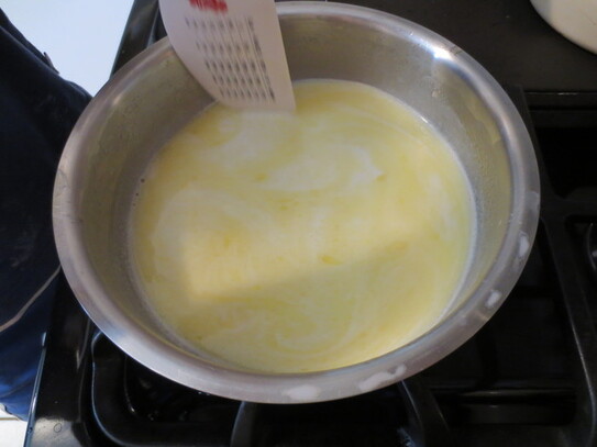 Ciocolata se rade pe o răzătoare fină şi se pune într-o crăticioara. Se adaugă untul şi laptele şi se pune la foc mic pentru câteva minute, amestecând uşor până cad fulgii de ciocolată se topesc. Se ia de pe foc şi se lasă deoparte să se răcească.