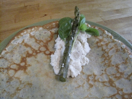 Pentru a asambla clătitele, se întinde 1 lingură (15 ml) din umplutura de urdă pe jumătatea de sus a fiecărei clătite. Sparanghelul se pune pe mijlocul umpluturii, apoi se adaugă câte o frunză de busuioc sau salată, alături de sparanghel. Îndoiţi clătita în sus şi peste sparanghel, apoi rulaţi. Continuaţi la fel cu restul clătite rămase.