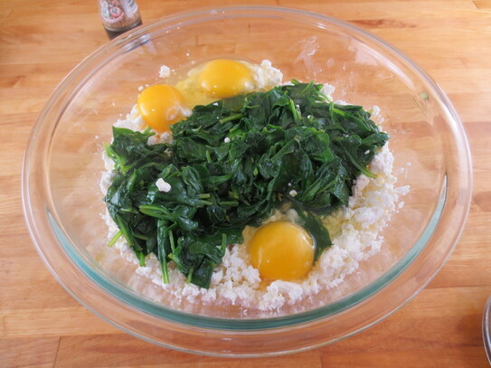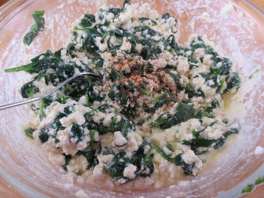 Brânza se zdrobeşte bine cu o furculiţă, apoi se amestecă împreună cu untul şi smântâna, spanacul şi 1/2 linguriţă de sare. Se adaugă ouăle şi se amestecă bine. La sfârşit se condimentează cu nucşoară.