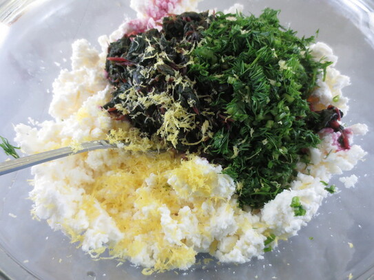 Brânza se zdrobeşte bine cu o furculiţă: două treimi din cantitate se amestecă împreună cu loboda, coaja rasă de lămâie şi mărarul.