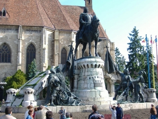 Matei Corvin a fost cel de-al doilea fiu al lui Iancu de Hunedoara. Rege al Ungariei din 1458, când a fost înscăunat la vârsta de 15 ani, până în 1490, Matei Corvin a contribuit substanţial la prosperitatea oraşului său natal, Cluj, susţinând construirea şi întreţinerea unor biserici, printre care şi marea Catedrală "Sfântul Mihail", şi acordând clujenilor o serie de privilegii economice.