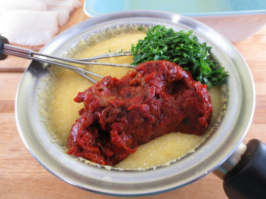 Cod la cuptor cu mămăliguţă şi ardei copt - rapid şi gustos