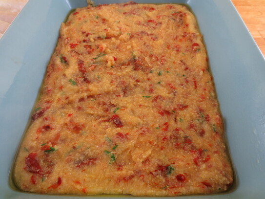 Amestecul de mămăligă se întinde în tava de copt într-un strat uniform.