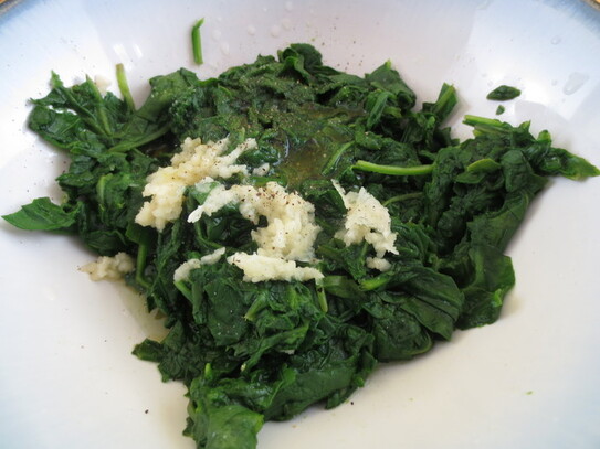 Spanacul opărit şi tocat se amestecă cu usturoiul tocat, dat prin presa de usturoi, cu 2 linguri de suc de lămâie şi o lingură de ulei de măsline, după care se presară cu puţină sare şi piper. Spanacul se întinde în strat subţire peste mămăliguţă.