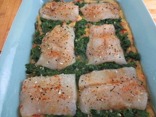 Fileurile de cod se aşează peste stratul de spanac.