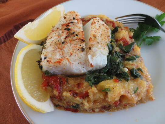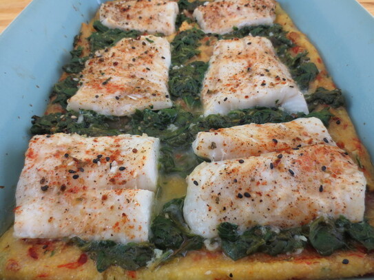 Încercaţi această reţetă de peşte deosebit de hrănitoare şi sănătoasă, bogată în arome şi culori, în care peştele se prepară la cuptor pe un pat făcut din spanac scăzut aromat cu usturoi şi mămăliguţă combinată cu ardei copt şi pătrunjel verde.