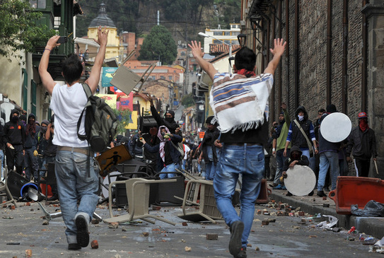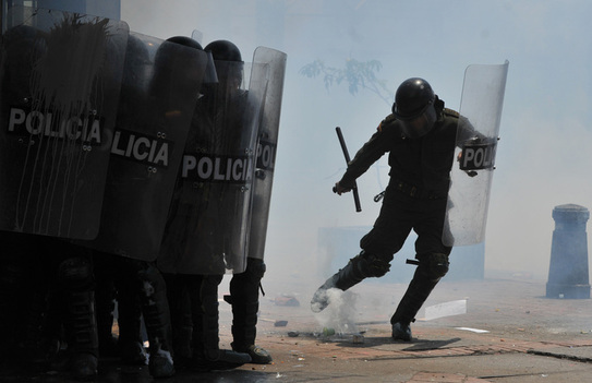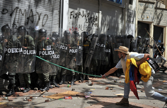 Ieri au fost numărate, potrivit unor surse ale Ministerului de Interne, 48 de evenimente diferite în peste 70 de blocuri stradale în opt regiuni. Revolte şi momente de tensiune au fost înregistrate în unele zone ale capitalei, unde, purtând poncho din lână tradiţionale şi Sombreros, fermierii au mărşăluit pe sunetele fluierelor, fluturând steagul naţional, adunându-se în Plaza Bolivar, în centrul istoric, unde au fost dispersaţi de către poliţişti. Au fost, de asemenea, raportate jafuri şi vandalism, vehicule incendiate şi poliţişti atacaţi cu lovituri de bastoane şi pietre. În trei zone dens populate din sudul şi nord-vestul oraşului, primarul opoziţiei de stânga, Gustavo Petro, a impus stare de asediu de la 20:30 de joi până la ora 5:00 (ora locală) de vineri.