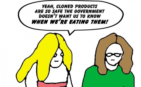 Asemenea cazurilor cerealelor Roundup Ready si al hormonului de crestere la bovine - scandaluri in care a fost implicata compania Monsanto, care este una dintre cele mai mari producatoare de organisme modificate genetic din lume - guvernul sustine ca produsele clonate sunt atat de sigure incat nu trebuie etichetate. Dar raportul FDA (Administratia pentru Alimente si Medicamente) din 2008 “Clonarea animala: O evaluare a riscului” si un raport din partea Autoritatii Europene asupra Sigurantei Alimentare — eliberate in acelasi timp — ridica intrebari asupra sanatatii animalelor clonate, asupra sigurantei laptelui si carnii lor, si chiar a sigurantei procesului de clonare insusi.