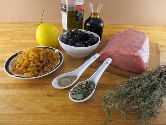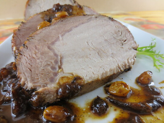 Cotlet de porc la cuptor cu sos de prune uscate şi stafide