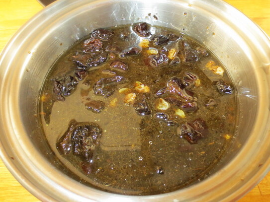 În sucul rămas se adaugă prunele tăiate mărunt şi stafidele. Se fierbe la foc mic, până când sosul începe să se îngroaşe. Dacă doriţi un sos mai consistent puteţi adăuga o linguriţă de amidon dizolvat în apă rece. Sosul se potriveşte de sare şi piper, iar la sfârşit se adaugă sucul de la o jumătate de lămâie. Pentru un sos picant, adăugaţi puţin ardei iute mărunţit.