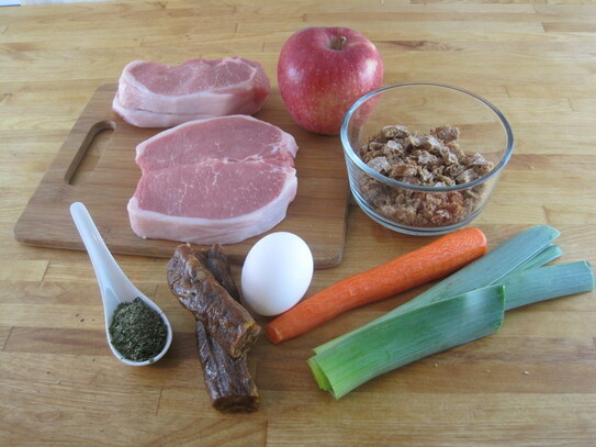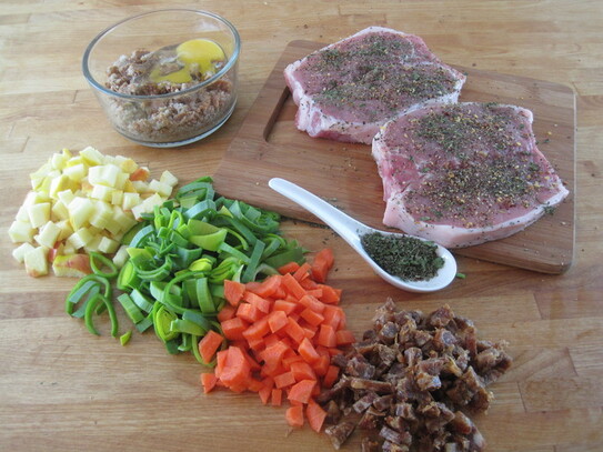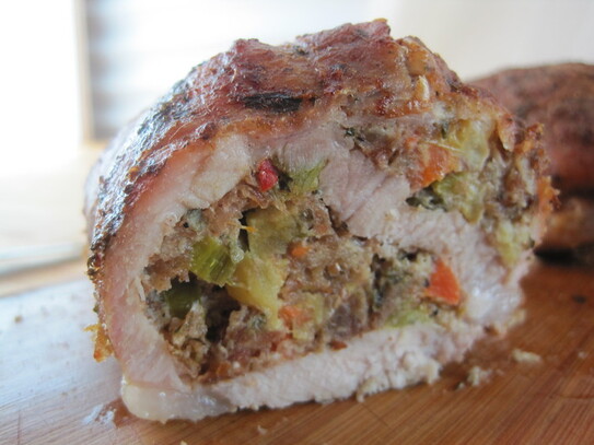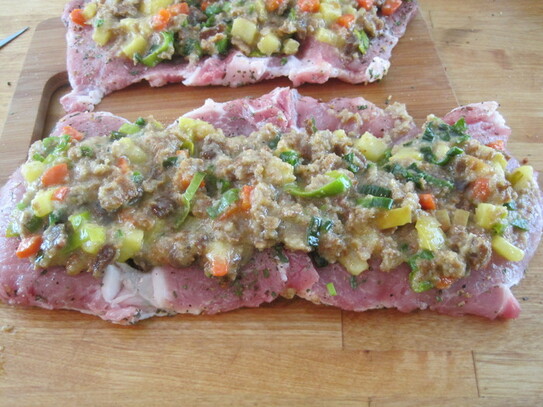 Savurează împreună de cei dragi o friptură delicioasă din cotlet de porc umplut cu legume, măr şi cârnat afumat.
