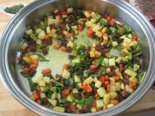 Pentru prepararea umpluturii, se începe mai întâi cu înmuierea pesmetului sau crutoanelor în apă sau supă de oase. După ce apa a fost absorbită, se sparge oul şi se amestecă până când se omogenizează.